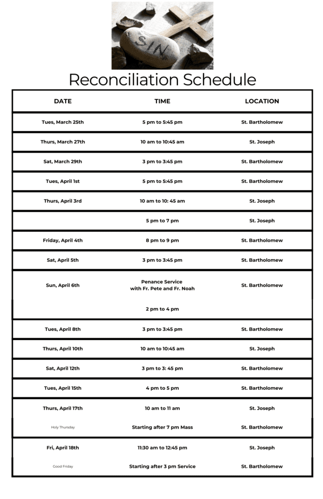 During this Lenten season, St. Bartholomew and St. Joseph will be offering additional reconciliation times. All available reconciliation times and two special reconciliation events are listed below.